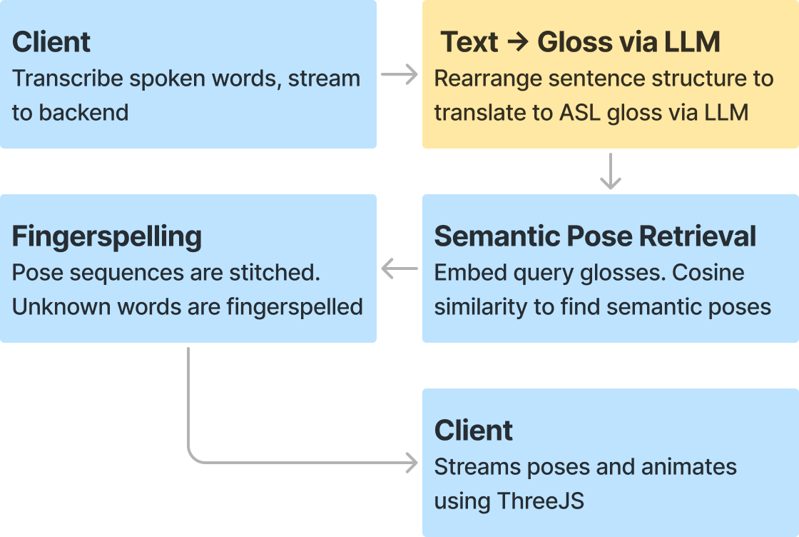 ASL has its own grammar that differs significantly from English-- different word order, dropped articles, different verb conjugation. I used GPT-4o to translate spoken English into ASL gloss (a written representation of ASL signs), rearranging word order and dropping unnecessary words. Each gloss token is then embedded with MiniLM and queried against the pose database. If the cosine similarity passes a 0.70 threshold, the system retrieves and plays back the matching pose animation. If not, it falls back to fingerspelling the word letter by letter.