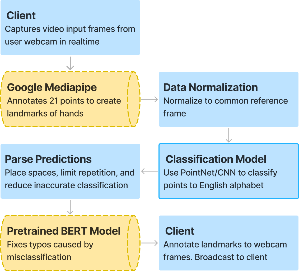 My high school, Burnaby South, was home to the only Deaf high school in British Columbia. Having taken ASL for over three years, I saw firsthand how much communication between Deaf and hearing students still depended on typing on phones or waiting for interpreters. Most existing tools stopped at speech-to-text or fingerspelling and assumed the burden of translation lay on Deaf users. I wanted to build a two-way system that respected ASL as a complete language rather than a visual form of English-- allowing someone signing to be understood in spoken English, and someone speaking to be understood visually in ASL, without forcing either to switch languages.