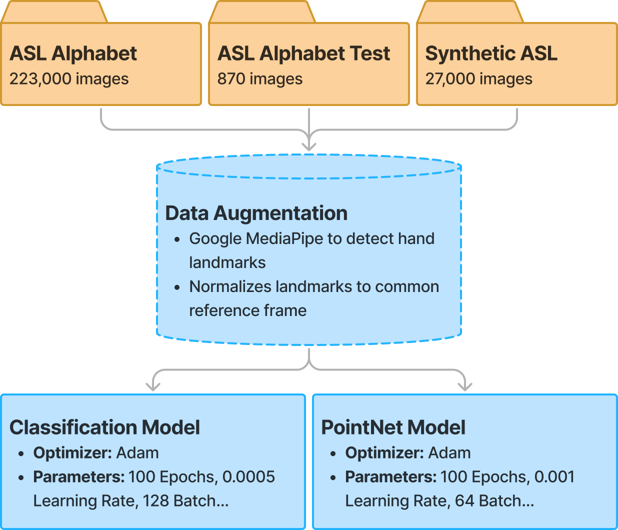 I preprocessed about 250,000 images from three Kaggle ASL datasets down to ~150,000 usable landmark arrays (after filtering frames where MediaPipe couldn't detect all 21 landmarks), and removed the dynamic letters J and Z since they require motion. I trained two classifiers: a custom 2D CNN with two convolutional blocks, dense layers, and dropout (99.7% validation accuracy), and a PointNet implementation that treats the landmarks as a 3D point cloud with permutation-invariant max pooling.